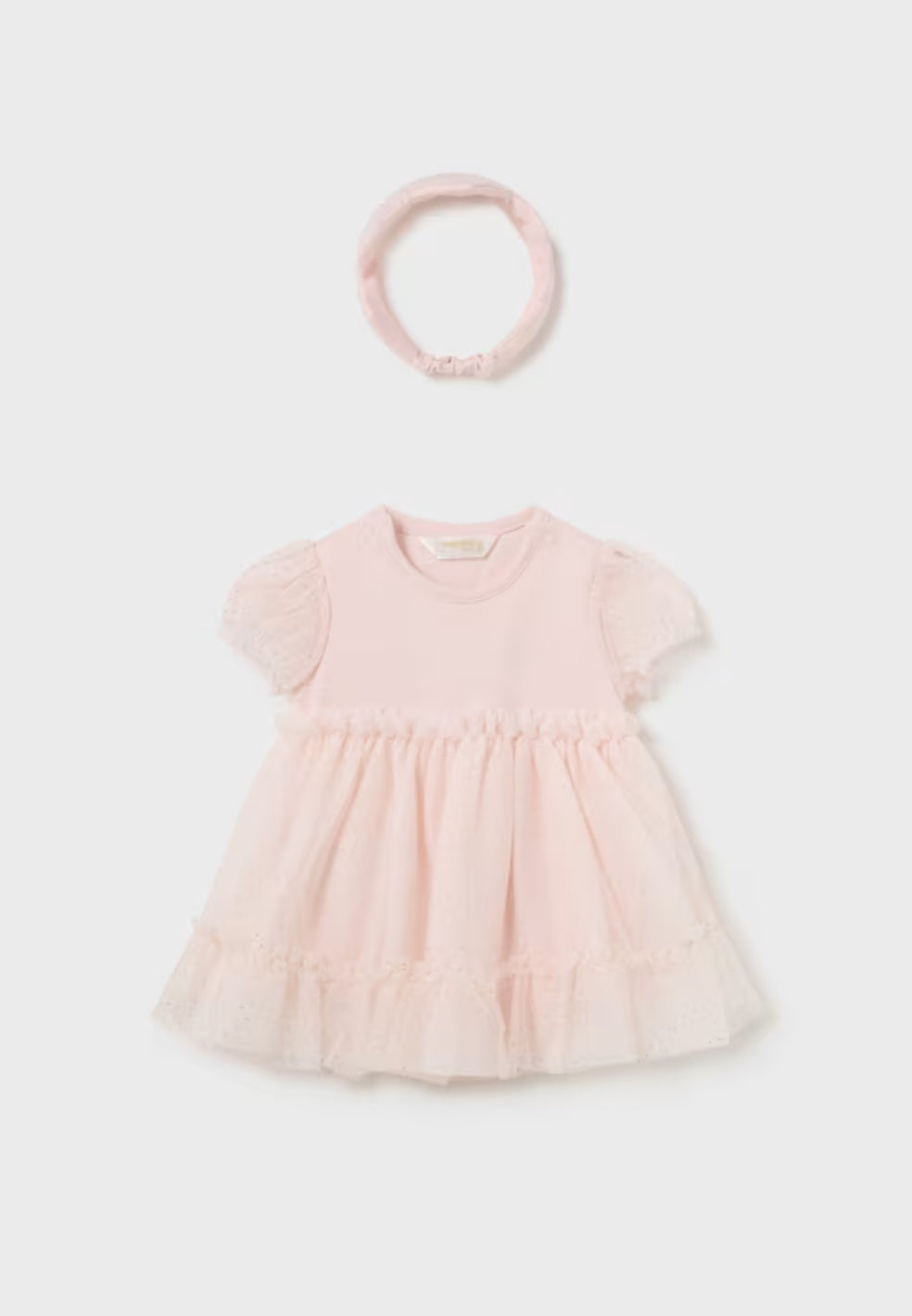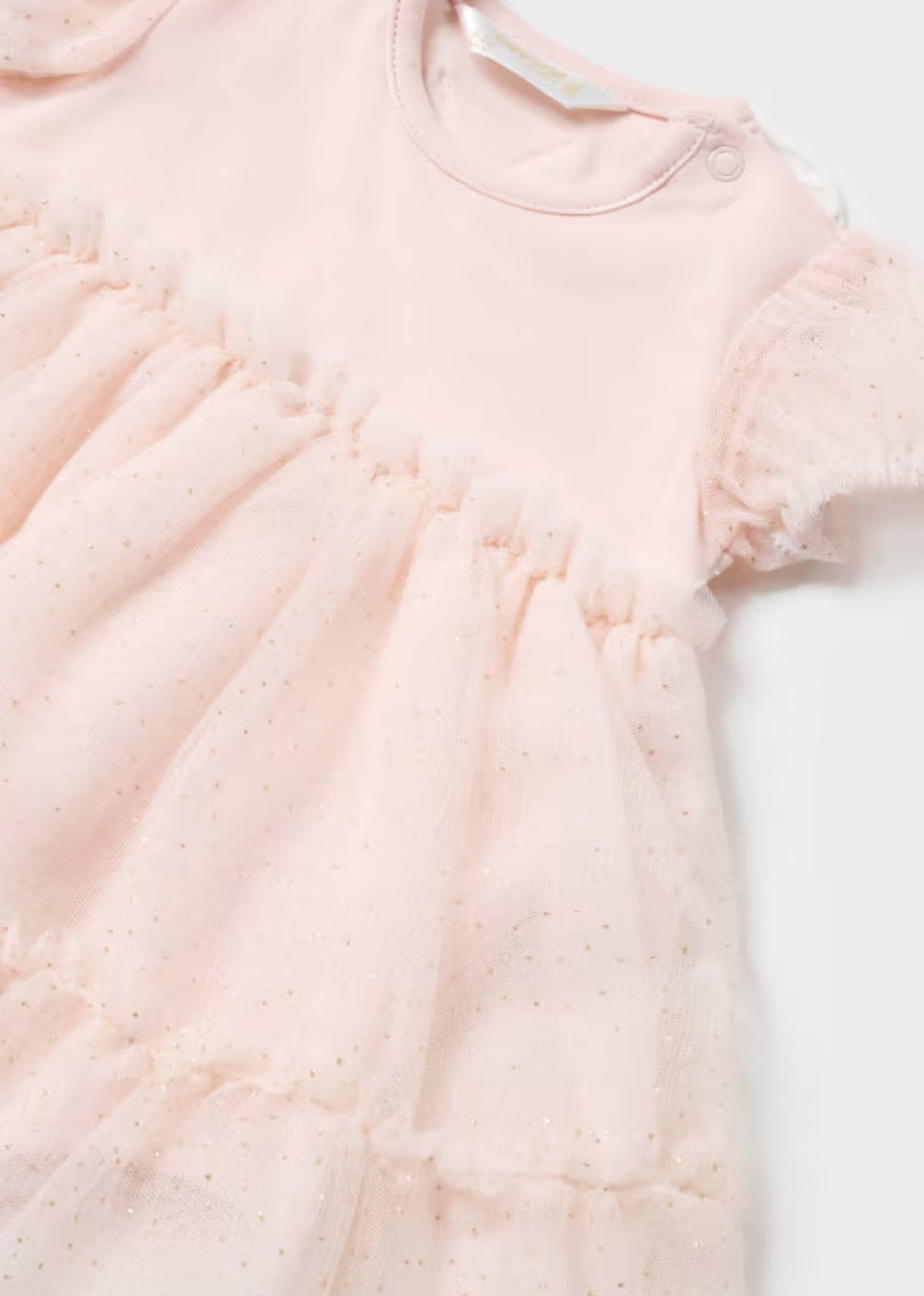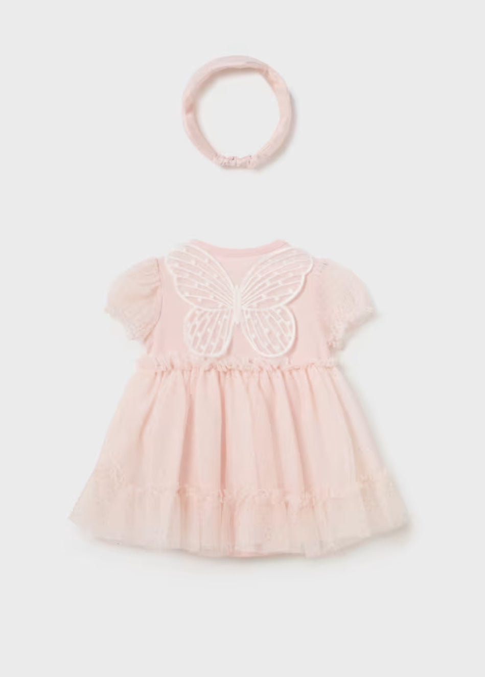 Lovely for a special occasion, a sweet pale pink dress set for baby girls. Made in soft cotton jersey, the dress has a sheer tulle skirt covered in glittery gold dots for a shimmery sparkle. There are pretty puffed sleeves in coordinating tulle, with a beautiful butterfly appliqué on the back. In a practical bodyvest style, the dress has popper fastenings on the shoulders and between the legs for easy dressing. The matching headband, shaped like a princess crown, completes this charming look.